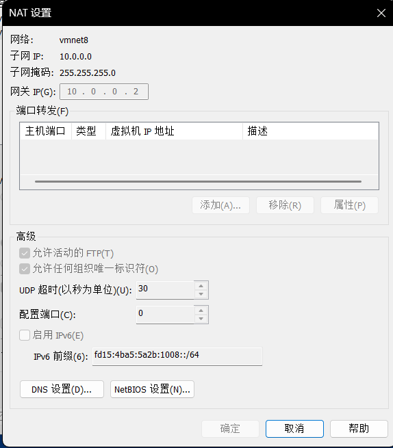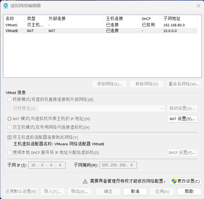 编辑-->虚拟网络编辑器-->更改设置-->禁止DHCP-->修改子网地址为:10.0.0.0,子网掩码不变。