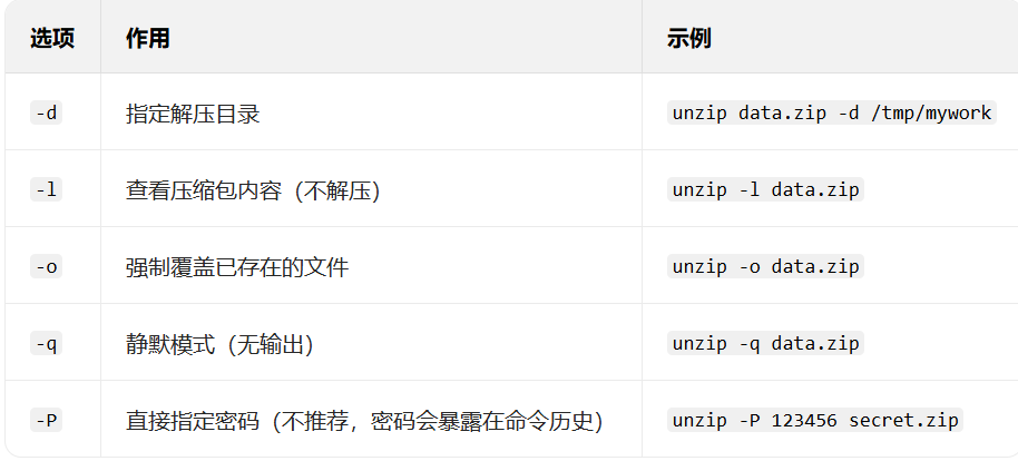 查看.gz 文件内容(不解压):zcat file.txt.gz(直接看压缩文件里的文本)。