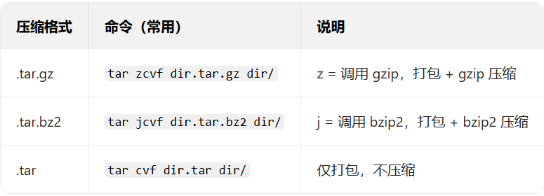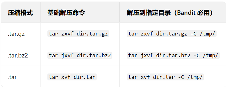 tar 本身是 “打包工具”(把多个文件 / 目录打成一个.tar 文件),但可通过 -z(调用 gzip)、-j(调用 bzip2)、-J(调用 xz)实现 “打包 + 压缩”,是 Linux 处理目录压缩的首选(Bandit 中嵌套压缩必用)。